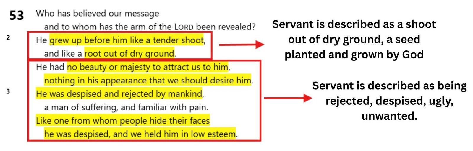 Two main descriptions here as seen above in the diagram, a servant who is described as a shoot planted and grown out of dry ground, and the servant being rejected, despised, and unwanted. Does this fit Israel? Yes! The Tanakh explicitly gives those exact descriptions to Israel.