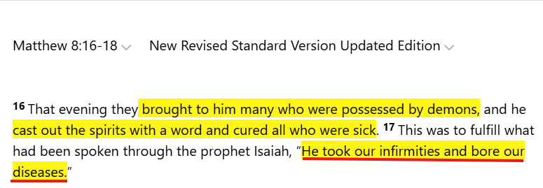 “And when Jesus entered Peter’s house, he saw his mother-in-law lying sick with a fever. He touched her hand, and the fever left her, and she rose and began to serve him. That evening they brought to him many who were oppressed by demons, and he cast out the spirits with a word and healed all who were sick. This was to FULFILL what was spoken by the Prophet Isaiah: “He took our illnesses and bore our diseases.” — Matthew 8:14-17 (ESV)