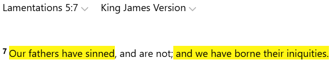 Now, just to show this language of “taking on someone’s iniquities” being used in the Tanakh without implying any taking someone else’s sins and becoming guiltless. In Lamentations 5:7, the author speaking about the exile says that the righteous remnant are bearing their fathers sins and iniquities! But obviously this doesn’t imply that they literally took their moral guilt of their fathers while their fathers became guiltless. All it’s saying is that because their father sinned against God, they are facing the consequence of God’s punishment together with them.