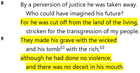 As for verse 9, there is a clear parallelism happening, grave = death, rich = wicked. The rich all over the Tanakh are seen as wicked, which is why the parallelism makes sense. The idea is that Israel will be killed and buried outside of their land amongst sinners & gentiles! For example, Amaziah the priest is told by the prophet Amos that he will be taken into exile, his children will be killed, and that he himself will die in an “unclean” land,