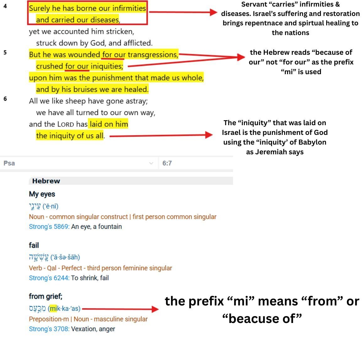 Here’s where it gets a little tricky, this whole “for our iniquities” language sounds familiar to a Christian, as they believe Jesus was a literal substitutionary atonement for sins, but that is not what the author of Isaiah has in mind, as the diagram above shows, the Hebrew doesn’t even say “for our” rather it uses the prefix “mi” which means “from” or “because of”. the Tanakh tells us over and over that through the suffering and exaltation of Israel, the nations will repent and turn to the true God, therefore it is because of Israel that the nations are spiritually healed of their diseases. Consider the following passages: